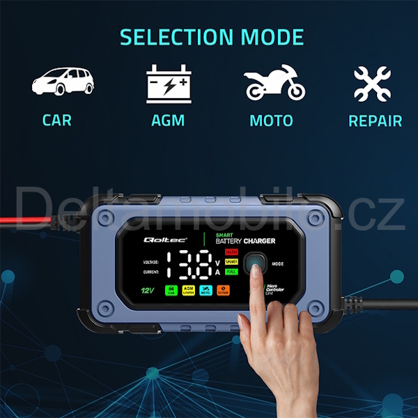 Nabíječka značky Qoltec se vyznačuje mikroprocesorovou přesností při nabíjení a nabízí 4 režimy , což výrazně zjednodušuje proces nabíjení. Pro různé typy baterií potřebujete pouze jednu nabíječku a podporuje : - režim Car pro gelové, SLA, mokré, DEEP CYCLE, EFB a kalciové baterie, - režim AGM určený pro baterie AGM, - režim Moto určený pro baterie s maximálním nabíjecím proudem 1,5 A, - režim Repair pro baterie, které vyžadují repasi.